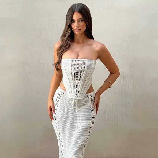 Elegant Women's Three-Piece Set With Deep V-Neck Wrap Headscarf Strap Long Skirt And Vest In Pure Desire Style Casual Wear